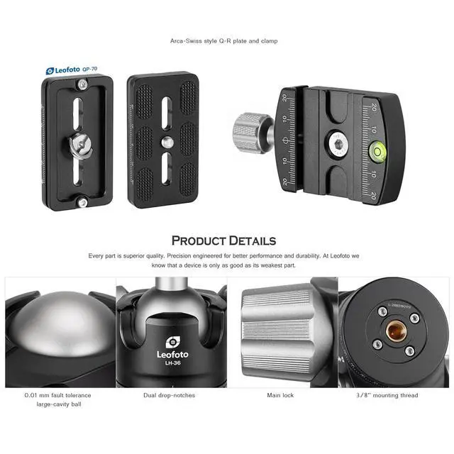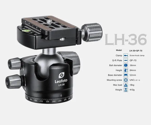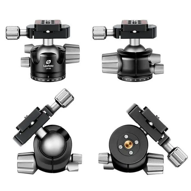 Included LH-36 Ballhead: Attached ball head is fitted with a ball locking knob and the pan base has a separate locking mechanism and is laser engraved in 2.5 degree increments from 0-360 degrees to ensure precise repeatability. There are 1/4"-20 threaded Accessory Socket for Monitor, Microphone, LED light or More