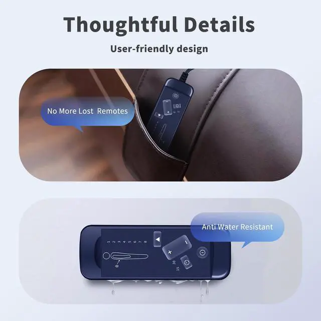Intuitive One-Touch Control Panel:Navigate your recliner's features effortlessly with our user-friendly remote. The clearly labeled buttons allow simple control of all chair functions - from basic reclining to specialized massage modes. Perfect for users of all ages, this straightforward design eliminates confusion while providing complete command of your relaxation experience.