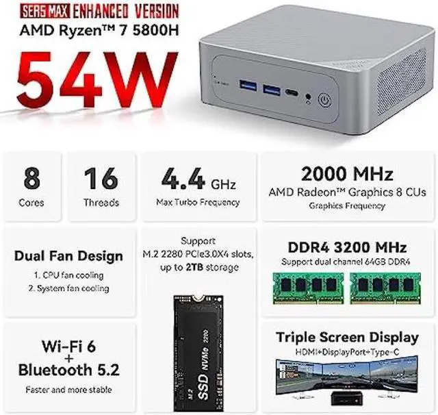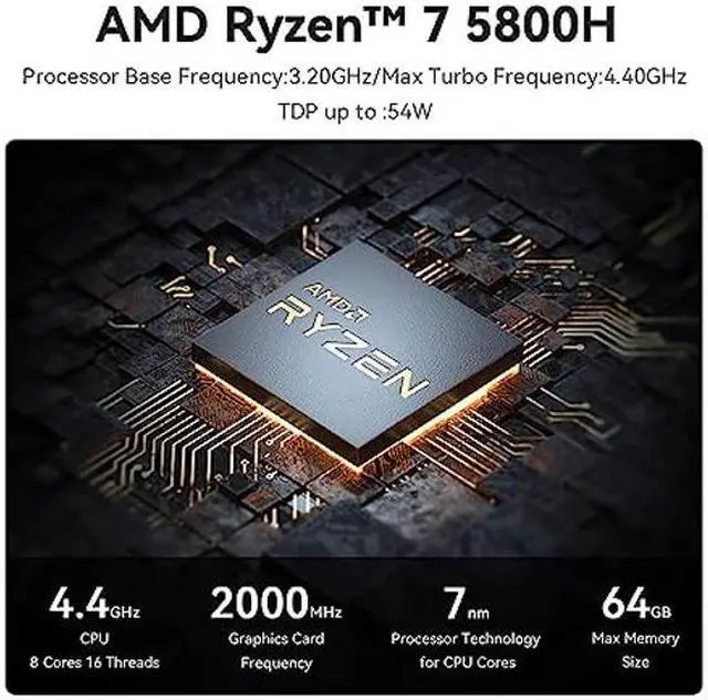 [(Faster & Better AMD Processor)] The Beelink SER5 Mini PC is powered by AMD Ryzen 7 5800H (8C/16T, L3 cache 16MB). The base frequency is 3.2GHz / the dynamic frequency can reach 4.4GHz. Features revolutionary 7nm technology, and MAX 57W TDP for a next-generation multi-tasking experience that takes processing speeds. It is widely used for AAA gaming, image editing(CAD, PS, Pr, Ai), office software, creative design, programming, and HTPC/Zoom meetings/Skype, etc.