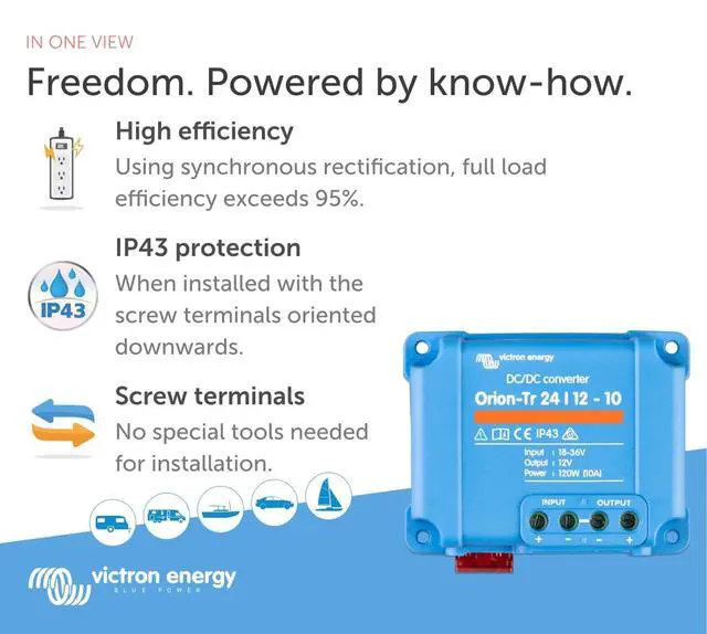 ^^ IP43 Protection: When installed correctly, the Orion-Tr DC-DC Converter provides splash-resistant IP43 protection, making it ideal for environments with occasional moisture exposure, without compromising reliability or performance ^^