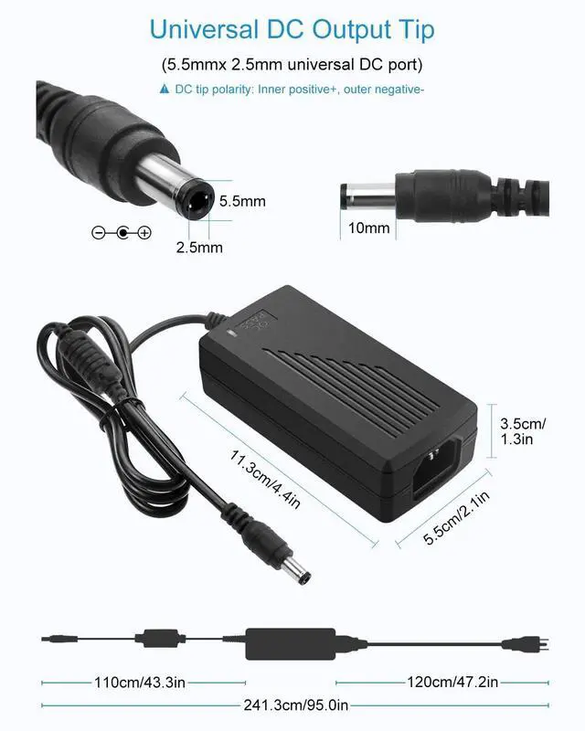 ; output: 12V DC, 5A 60W max; Works with devices that draw less than 5A, such as 1A, 1.5A, 2A, 2.1A, 3A, 4A, 4.8A, 5A ^^ DC plug size is 5.5 mm x 2.5 mm. Compatible with 5.5 mmx 2.1 mm. Plug polarity is inside "+", outside"-". Please check the power port of your device to confirm whether they are compatible.