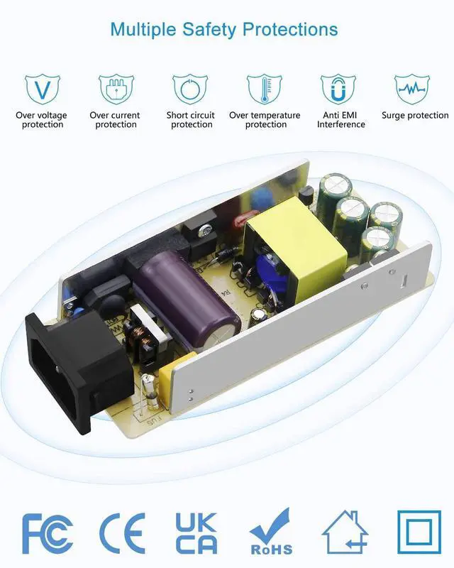 ^^ Safety features: Automatic overload protection, over-voltage protection, over-current protection, over-temperature protection, short circuit protection. Meet FCC CE safety standard and RoHS environment standard. ^^ Sufficient 60W output power and 12V stable output voltage will protect your electronic devices from destruction. We recommend the max use less than 80% of the full loads. ^^ Great for 12V DC devices under 5A 60W, such as LED Strips, ham radio transceiver, CCTV Camerascar subwoofer amp, audio amplifier, wireless router, ADSL Cats, HUB, DVR NVR Security Cameras, etc. Indoor use only!