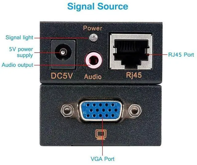 -Connect the Sender and signal source with one VGA (male to male) cable, and one DC 3.5 audio cable