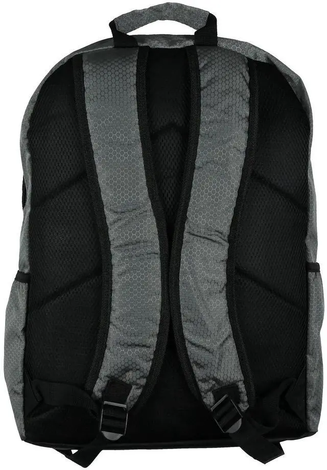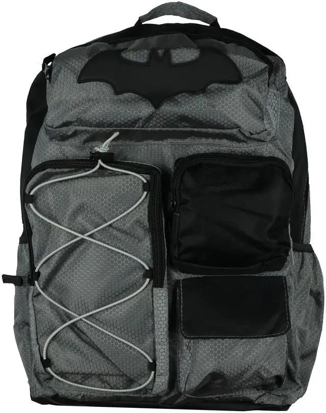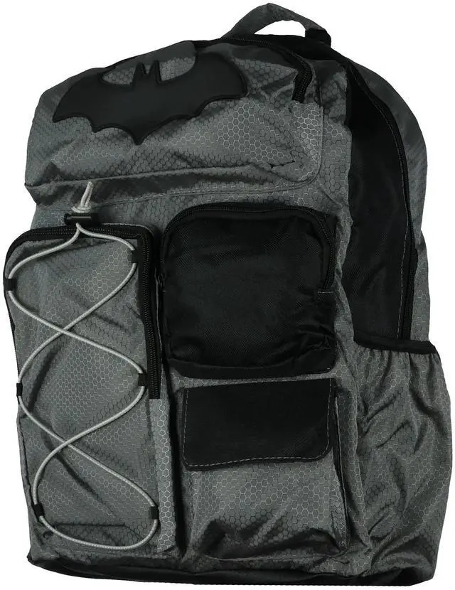 DescriptionBuilt with everyday utility in mind, this Batman laptop backpack blends functionality with subtle fan design. The black and grey color scheme with a subtle honeycomb print brings a modern edge, while the raised Bat symbol nods to the Dark Knight without overpowering the look. Its structure supports daily commutes and tech transport with a roomy main compartment and padded sleeve that fits most laptops. From external bungee cords for quick storage to smaller zip pockets for essentials, this tech bag delivers innovative organization throughout. Two convenient side pockets hold water bottles and small essentials.