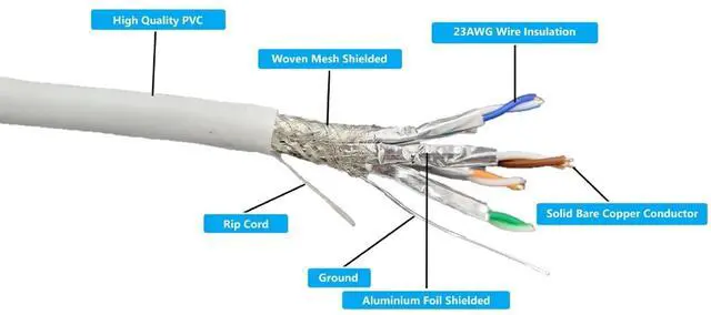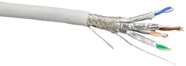 Micro Connectors' Bulk CAT7 Shielded Cable 250 feet of high quality, solid full copper wire with shielded and foiled twisted pair, ready for termination and routing. The braided shield with foiled twisted pair protects your data as it travels through the four twisted pairs of 23-gauge solid copper wires by wrapping it in a thin metal sleeve thus keeping electrical interference from things like fluorescent lights and electrical lines found in a drop ceiling or inside walls at a minimum. Simply pull the length required for your installation straight from the spool and terminate at your leisure.