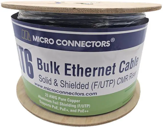 Micro Connectors' Bulk CAT6 Shielded Cable comes conveniently packaged in a wooden spool, providing you with 500 feet of high quality, shielded, 4-pair, solid, 550 MHz Cat6 Cable, ready for termination and routing.
