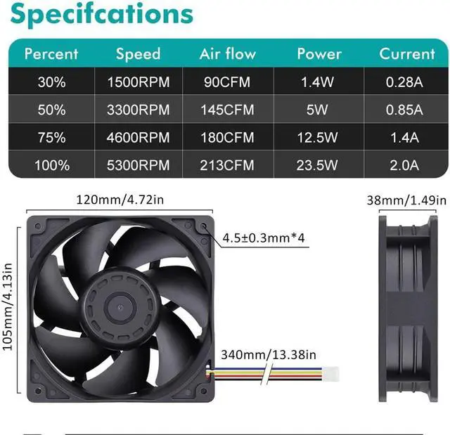 High Speed: This model is designed to maximize airflow and can be too loud at full speed for some applications. High airflow static pressure fan designed for projects that requires cooling or ventilation; or as a replacement fan for various products such as antminer case, gaming PC and mining machine, server CPU Case, chassis.