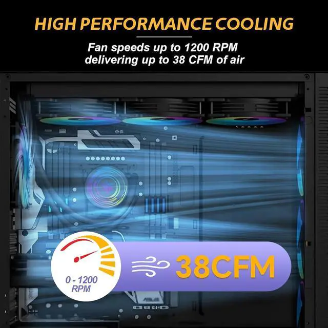 Quiet PC FansStrike the perfect balance between airflow and noise with a 1200 RPM fan speed and 38 CFM airflow. The revised curve blades ensure efficient cooling while minimizing noise levels (Noise level is 23dBA)