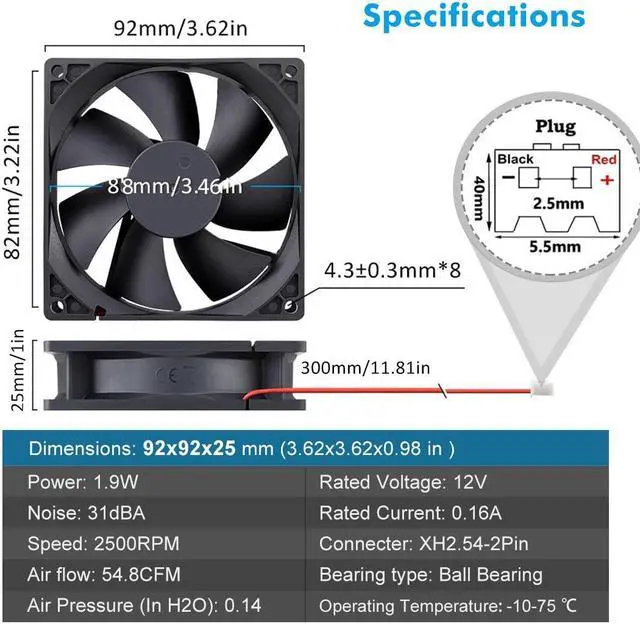 92mm FanDimension: 92mm (L) x 92mm (W) x 25mm (H) / 3.62 x 3.62 x 0.98 in. per fan / Please confirm the size and voltage of the fan before placing the order.