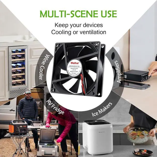 12v Cooling FanPerfect for small solar panel, pc case, dehumidifier, TV refrigerator, space heater, grow tent, wine cooler, electric boat, portable dryer and other audio video electronics.
