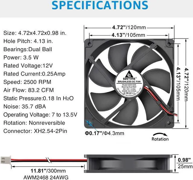 Dimension of outer the frame is 120mm (L) x 120mm (W) x 25mm (H) / The size of fan in inch is 4.72 in (L) x 4.72 in (W) x 1in (H); The center to center distance beween the mountiong holes is 105± 0.3 mm/ 4.13 in.