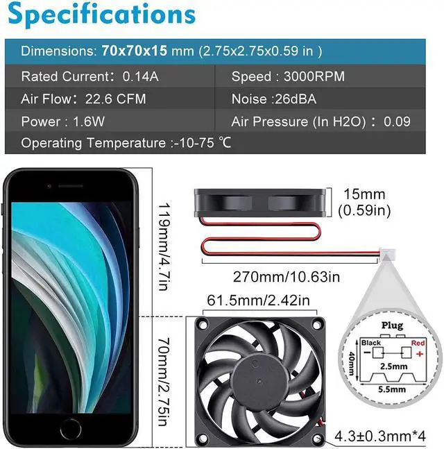 Dimension: 70mm (L) x 70mm (W) x 15mm (H) / 2.76 x 2.76 x 0.59 in. per fan