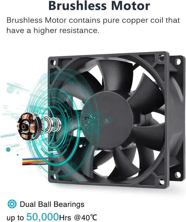 Brushless MotorThe fan comes with Dual-ball bearings which rated at up to 50, 000hrs; The fan moves a lot of air and includes a fan guard for protecting the fan from other objects