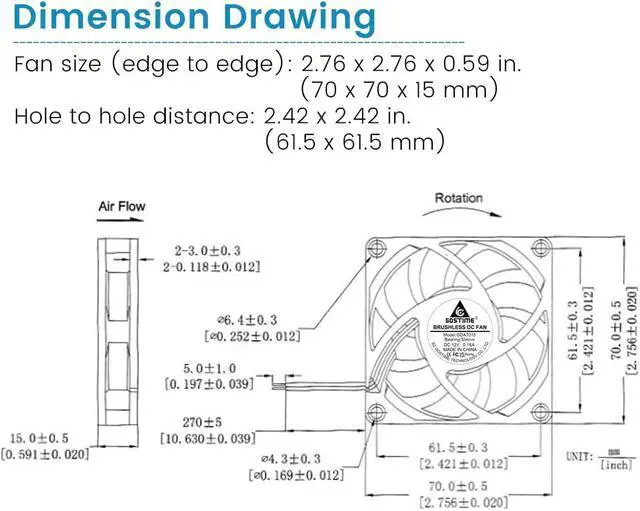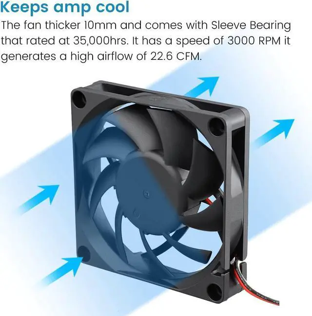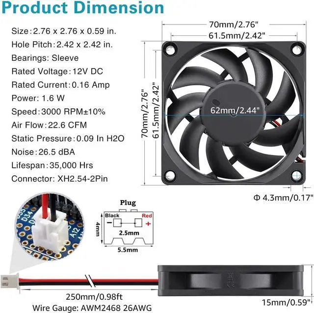Speed: 3000RPM Air flow: 22.6CFM Noise: 26.5 dBA