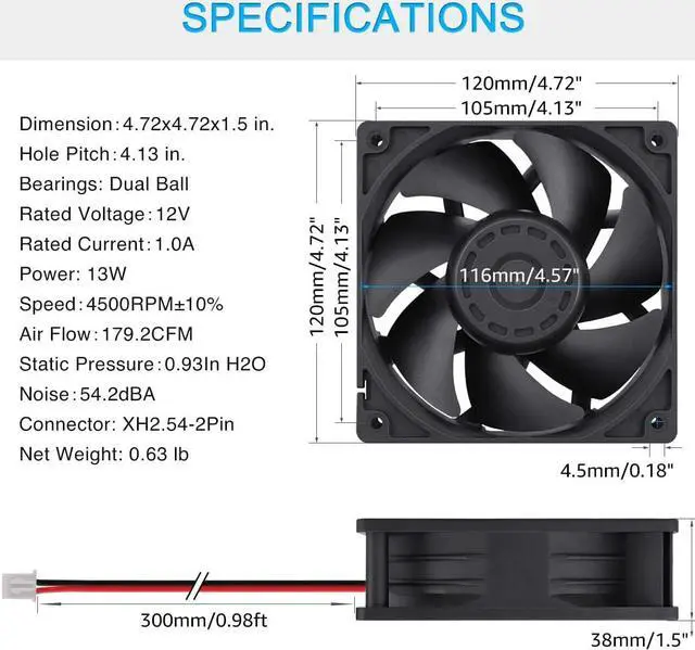 • Dimension of outer the frame is 120mm(L) x 120mm(W) x 38mm(H) / The size of fan in inch is 4.72in(L) x 4.72in(W) x 1.5in(H); The center to center distance beween the mountiong holes is 105±0.3mm/4.13in.