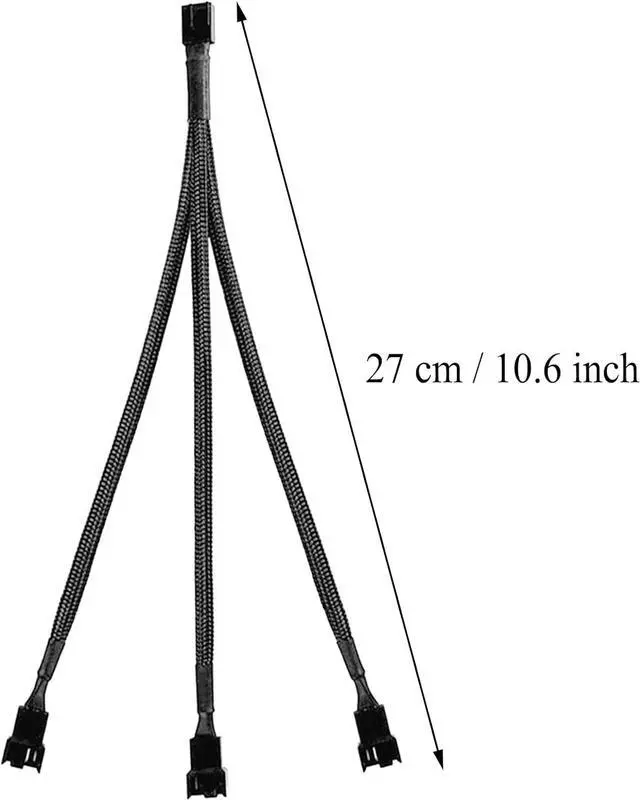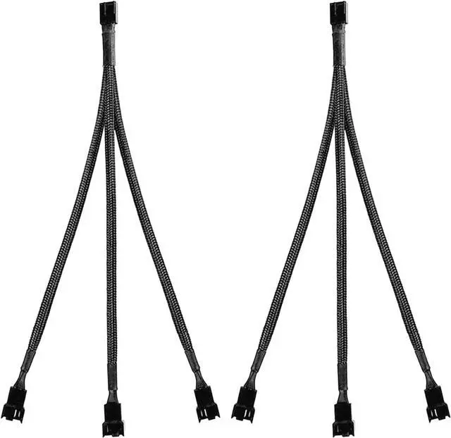 Package contents: 2 black 10.6 inch 1-to-3 splitter fan power supply extension cables, male to female connector plug.