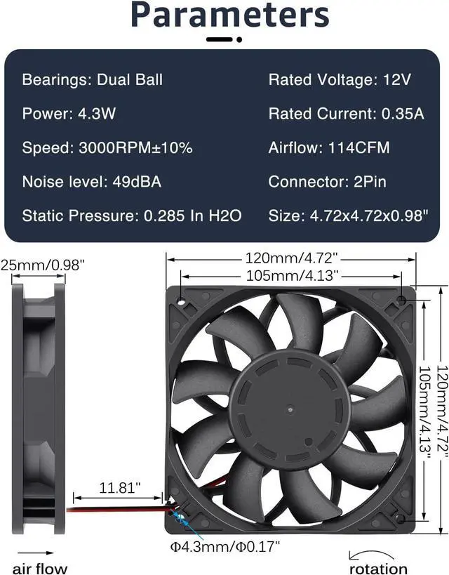 Dimension of outer the frame is 120mm (L) x 120mm (W) x 25mm (H) / The size of fan in inch is 4.72 in (L) x 4.72 in (W) x 1in (H); The center to center distance beween the mountiong holes is 105mm/ 4.13 in.
