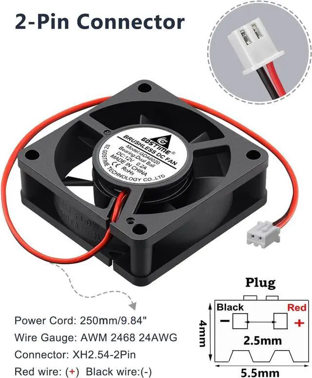 2-Pin Connector Operating Voltage: 7 to 13.5V; Please make sure that the positive and negative poles of the fan are connected correctly (Red wire: " +", Black: " -" )