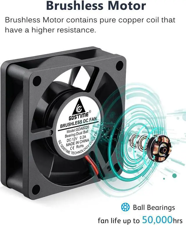 Brushless Motor Dual ball bearings have a lifespan of 50, 000 hours and allows the fans to be laid flat or stand upright