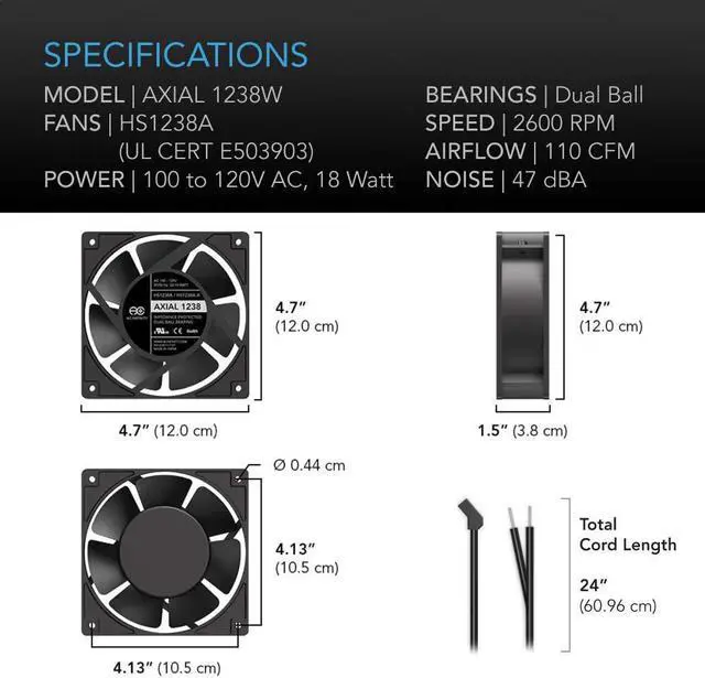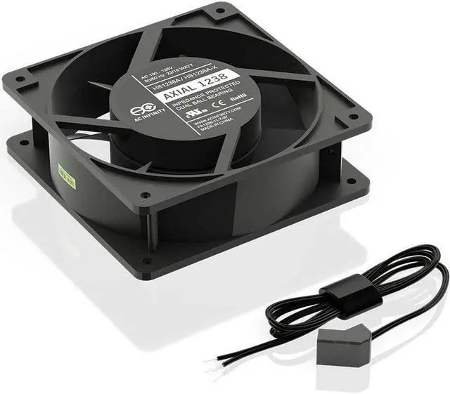 UL-certified fan with dual-ball bearings has a lifespan of 67, 000 hours. Can be mounted in any direction.