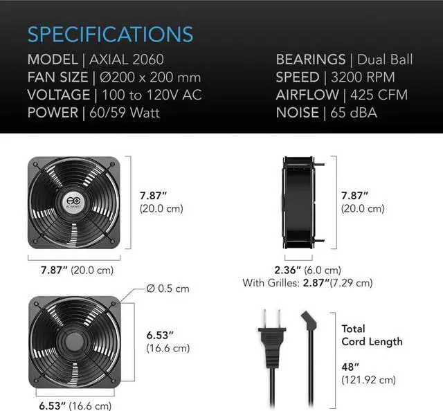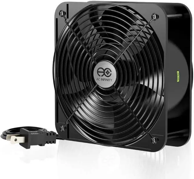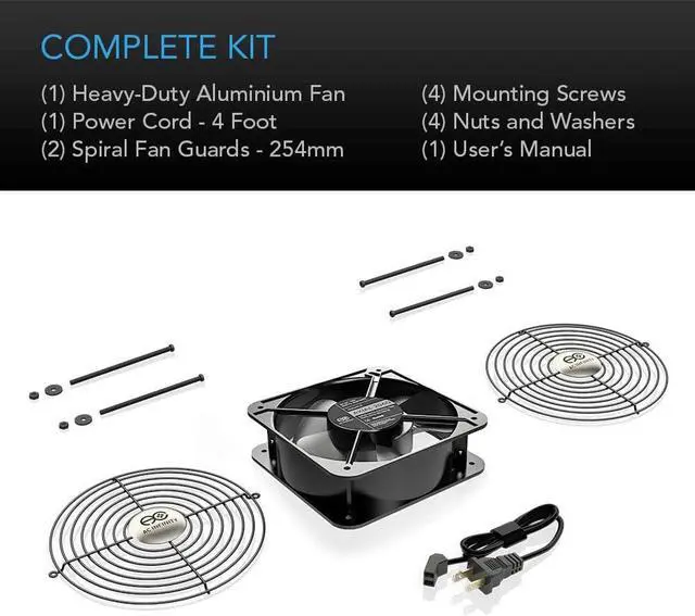 Includes a heavy-duty aluminum fan with power plug cord, two fan guards, and mounting screw set.