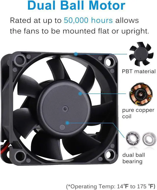 DUAL-BALL MOTOR Dual ball bearings rated at up to 50, 000 hrs allows the fans to be mounted flat or upright. PBT material housing meets UL 94 standards for resistance to flammability