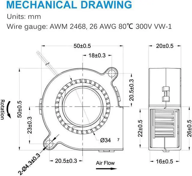 Dimension of outer the frame is 50mm (L) x 50mm (W) x 20mm (H) / The size of fan in inch is 1.97 in (L) x 1.97 in (W) x 0.78 in (H)