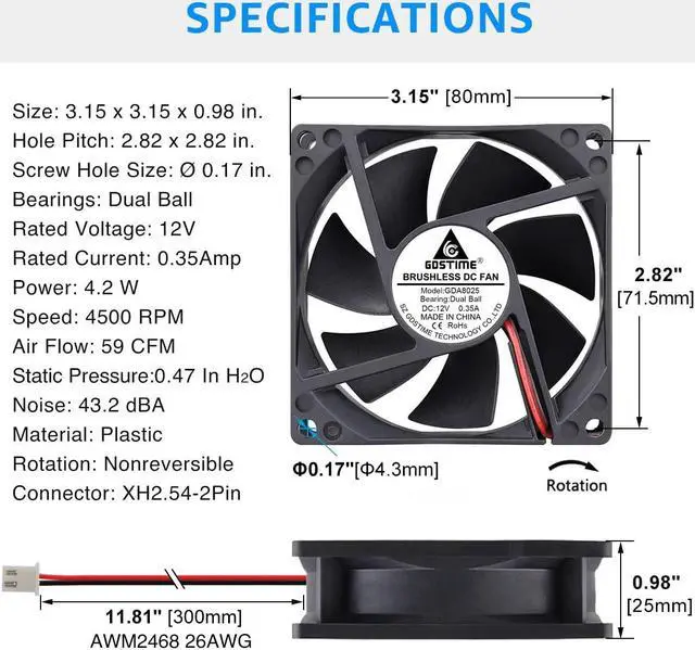 Easy to InstallFan size (edge to edge): 3.15 x 3.15 x 0.98 in. (80 x 80 x 25 mm); Hole to