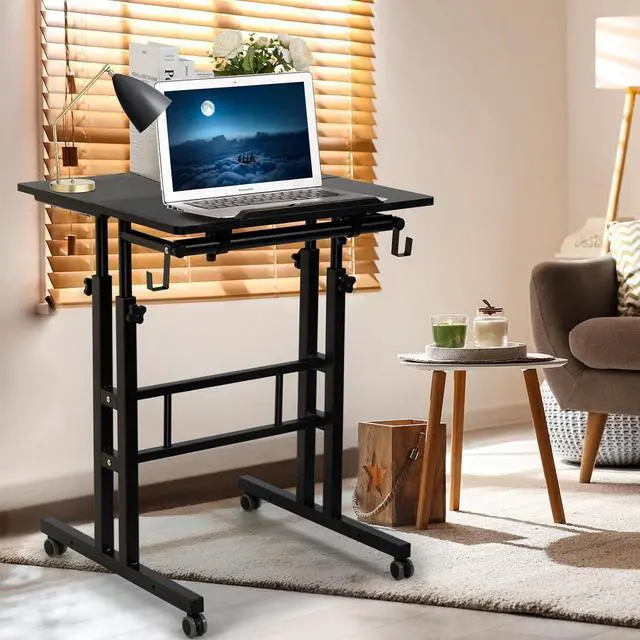 PORTABLE & EASY MOVE - The height of this rolling laptop desk can be adjusted from 27.5 " - 45.3 " as you wish, to sit or stand. 4 flexible rubber wheels with lock make mobile stand up desk move smoothly and stop wherever you want