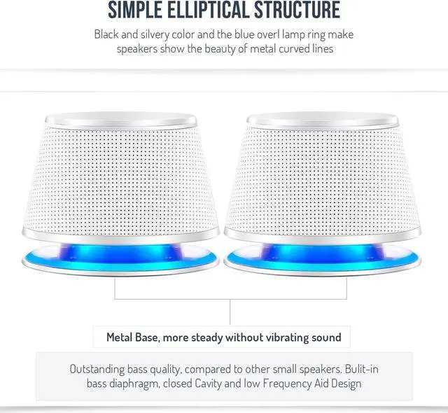 SIMPLE ELLIPTICAL STRUCTUREMetal and high quality plastics make it steady without vibrating sound. Black and silvery color and the blue oval lamp ring make speakers show the beauty of metal curved lines. Adopted the low-voltage digital power, the maximum power can be 5W x 2, ensure the sound clear, bright, rounded and thick. Small Body( 3.94 x 2.76. 2.95 inch) with powerful audio.