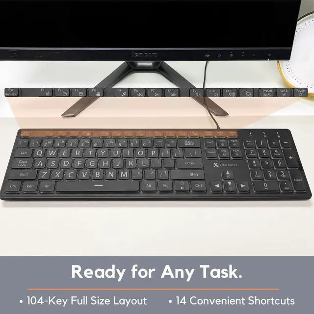 (Full Size Layout for Any Task): Equipped with a quiet 104-key configuration and 14 shortcut keys, this wired backlit keyboard will improve how you browse the web or make getting work done easier.