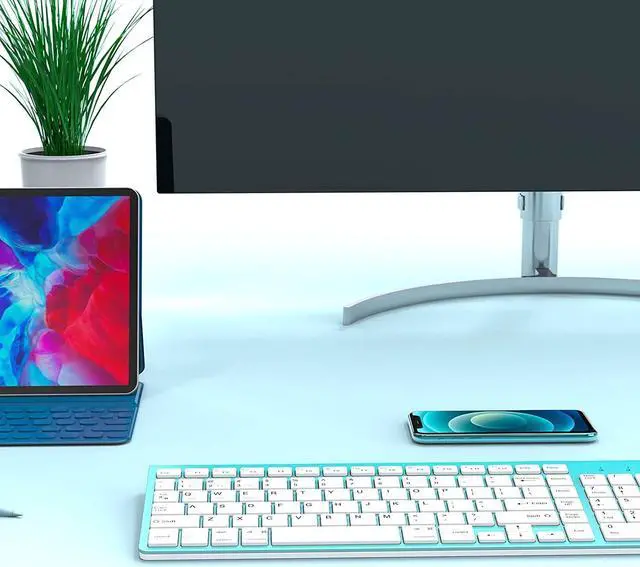 Elegant and Exquisite Design: This keyboard is thin and beautiful with new colors. It uses a matte silver material and a white particle non-slip chassis. The keyboard back stand is very ergonomic and can help you reduce wrist pressure caused by long-time typing.