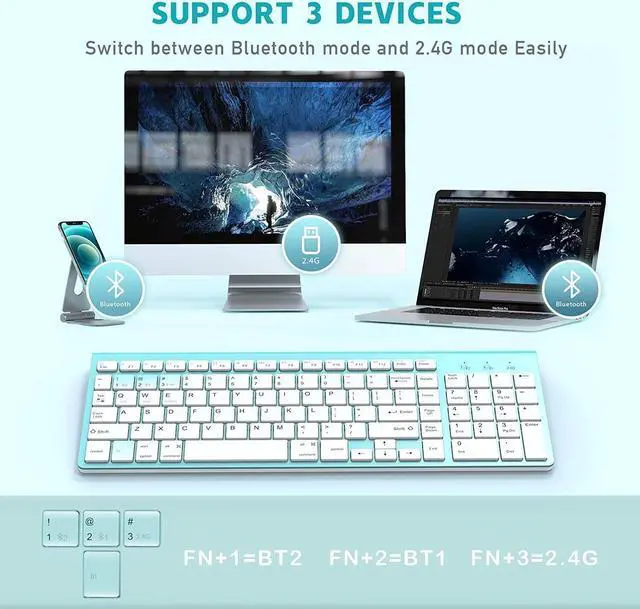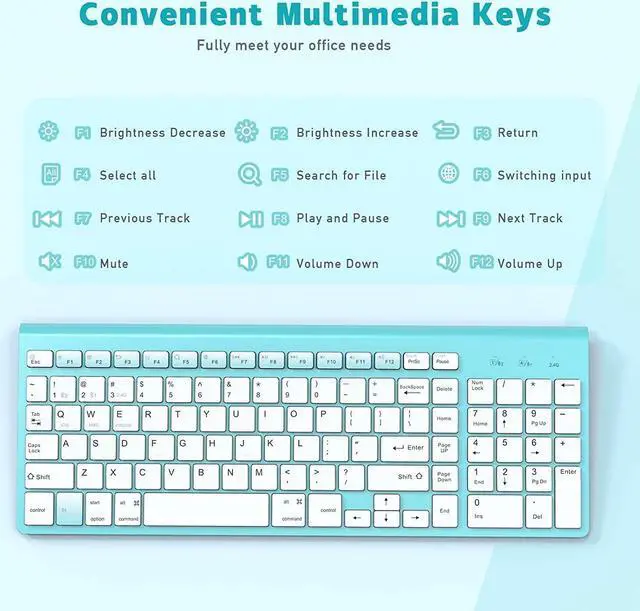 Quiet Click and Scissor- Switch: This bluetooth keyboard uses noise reduction technology to greatly reduce the sound of keystrokes. The Scissor-switch thin and light keys can relieve the fatigue on your wrist or fingers. At the same time, it can ensure a quiet and pleasing work environment.