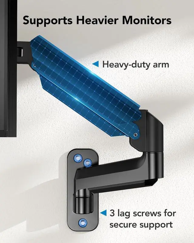Comfortable Work by Easy Adjustment- After over 20, 000 exercise tests, The built-in gas spring system of Huanuo single monitor arm wall mount makes the adjustment easier and more smooth. You can easily raises your monitors to eye level, which helps relieving the strain on your neck, shoulders, and back.