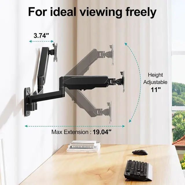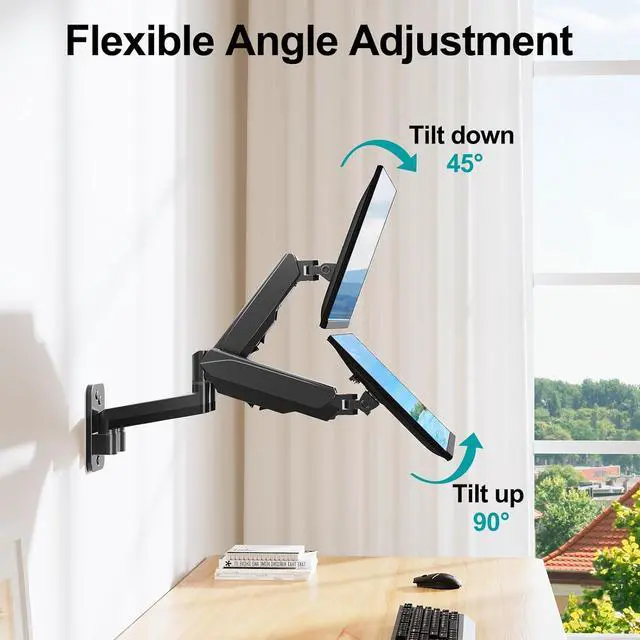 Full Motion Adjustments - Adjustable wall mount dual monitor offers +90° to -45° tilts, 180°swivel, and 360°rotation. The monitor arm can be extended up to 19.04 ", which supports you a more optimal viewing angle, and helps to reduce the pain in your neck, shoulders, and back.
