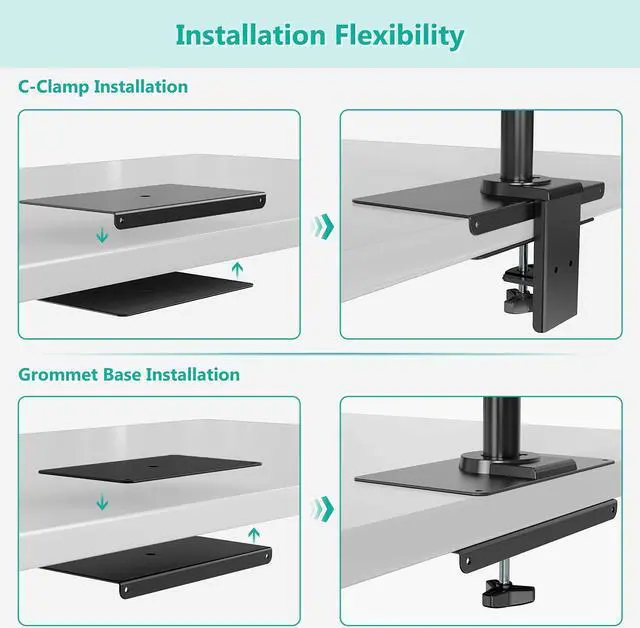 Compatibility: The 10.6 x 6 mounting plate is designed for Grommet or C-clamp installation on thin, wood, glass and other fragile desks. Fits most types of monitor mounts with Grommet or C-clamp install options on the market.