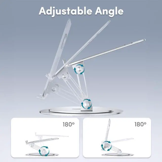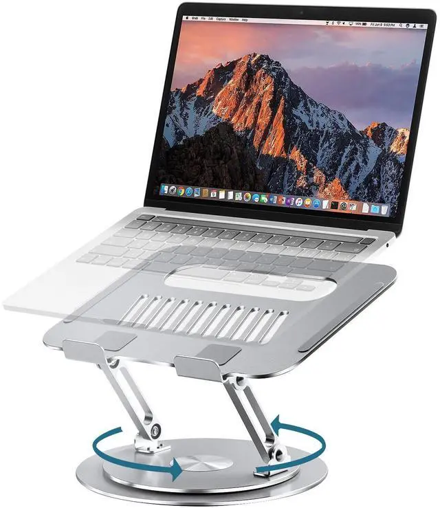 Rotation: This is a rotatable laptop stand with a dual-axis design that attaches to the base and allows you to rotate your laptop to any angle. This gives you a lot of flexibility in your work position and is suitable for sharing content in meetings or group project communication.
