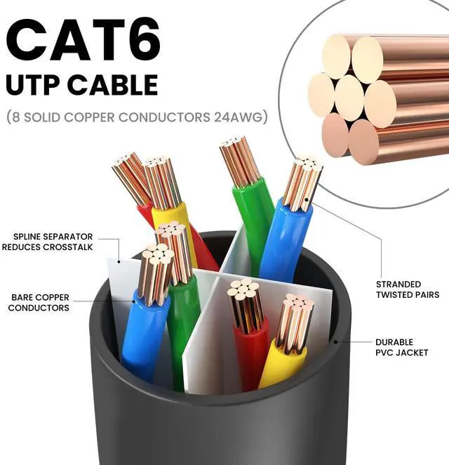 QUALITY CONTROL CAT6 CABLE - Each Cat 6 ethernet cable 6ft goes through rigorous testing to ensure a secure wired internet connection with exceptional speed and reliability. ^^ HIGH PERFORMANCE ETHERNET CABLE- High performance cat 6 ethernet cable support frequencies of up to 500 MHz and are suitable for high-speed 10GBASE-T internet connection for LAN network applications such as PCs, servers, printers, routers, switch boxes, and more, while remaining fully backward compatible with your existing network. ^^ CONFIGURATION OF CAT6 ETHERNET CABLE - The 6 feet cat6 ethernet cable features 8 solid copper conductors 24 AWG.