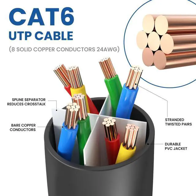 HIGH-SPEED PURE COPPER CABLE - The 15 feet Cat 6 ethernet patch cable features 8 solid copper conductors 24 AWG. Each of the 4 unshielded twisted pairs (UTP) are separated by a PE cross insulation to isolates pairs and prevent crosstalk and covered by a 5.8 mm PVC jacket with RJ45 connectors and gold-plated contacts. The molded strain relief boots help avoid snags that will damage your cables. They are molded for flexibility and resist common wear and tear. ^^ WIDE COMPATIBILITY LAN CABLE - Designed with extremely well-matched components for outstanding uniform impedance and very low return loss, providing lower crosstalk, and a higher signal-to-noise ratio.