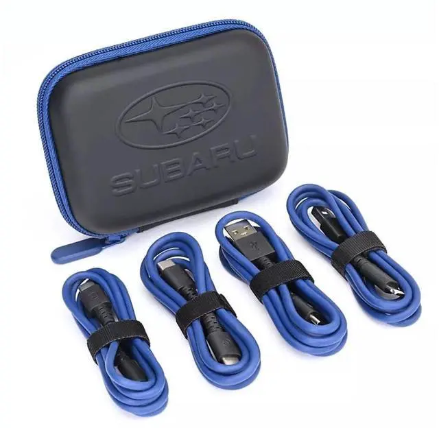 Genuine Subaru USB Charging cable set Your package will include oem sealed items. The package will include USB charging cable kit H671SFN000 Quickly charge mobile devices while youre on the go. Designed in signature Subaru blue, Genuine Subaru cables offer superior quality and durability compared to typical aftermarket cables. Packaged in a zippered Subaru-branded storage case, the set of four, 3 ft. cables allow you and your passengers to charge and connect while on the road. Includes cable ties to keep cables neat, tidy and organized when not in use.