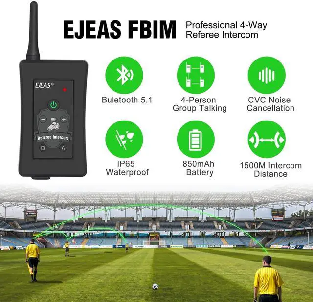 Referee Intercom]: Using optimized Qualcomm Bluetooth 5.1 chip, EJEAS FBIM can achieve quick pairing and keep low-energy consumption. It supports 4 people real-time intercom and the talking distance can reach 1500m (distance of 4 units). ^^ [CVC