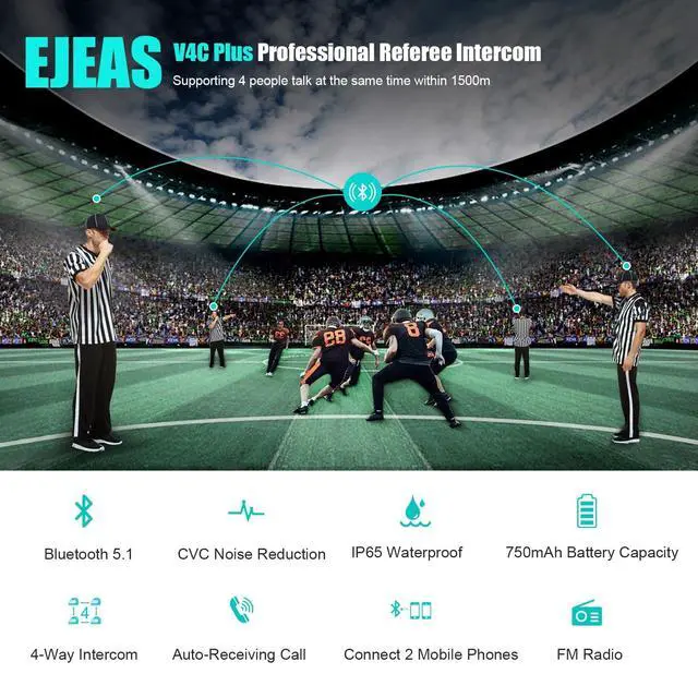 [Connectable to 4 Referees] EJEAS V4C Plus uses advanced Bluetooth 5.1 version chip, which can support up to 4 people to pair and talk at the same time. The maximum distance between each machine is 500M and the total distance of a group of 4 can reach about 1500M. ^^ [Noise Reduction & IP65 Waterproof] V4C Plus referee bluetooth intercom uses advanced CVC noise reduction technology to eliminate the echo and ambient noise of the call, so that you can enjoy more stable and crystal clear sound while moving. With IP65 waterproof function, V4C Plus referee headset can be used in any rainy and dusty outdoor environments.