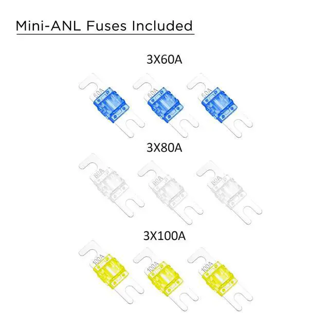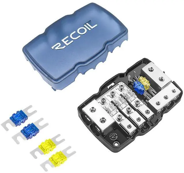 Recoil MPG3 3-Way Mini-ANL Fused Distribution Block with Ground Block, Each Positive and Negative Block with Two 0/2/4 Gauge Inputs & Three 4/8 Gauge Outputs, Fused Distribution Block with 9pcs Fuses