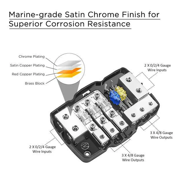 High Performance 3-Way Mini-ANL Fused Distribution Block and Ground Block, Each Power and Ground Block has 2 X 0/2/4 Gauge In, 3 X 4/8 Gauge Out