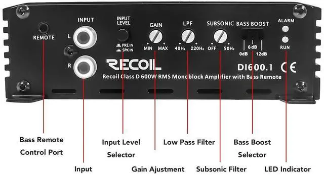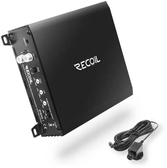 Class-D Mono-block Subwoofer Amplifier, 1200 Watts Max Power, RMS 600 Watts x 1@1Ohm; RMS 385 Watts x 1@2Ohm, RMS 235 Watts x 1@4Ohm ^^ Featuring a high-speed MOSFET power supply, premium grade internal components, as well as 4-way protection circuitry, the amplifier will safely operate at the highest levels of performance for hours on end. Highly efficient heatsinks keep the amplifier cool with a sophisticated new look. ^^ Recoil mono amplifiers come with bass remote control. Use it to customize your bass on the fly with just a turn of a knob.