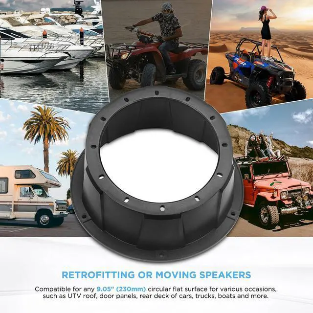 ^^ Recoil speaker pods are made of high-quality PP plastic with mounting flange, smooth, sturdy, shockproof and strong. They can endure almost any weather conditions. ^^ Recoil speaker pods can be mounted on any 230mm ( 9.05 ) circular flat surface for various occasions, such as UTV roof, door panels, rear deck of cars, trucks, boats and more.