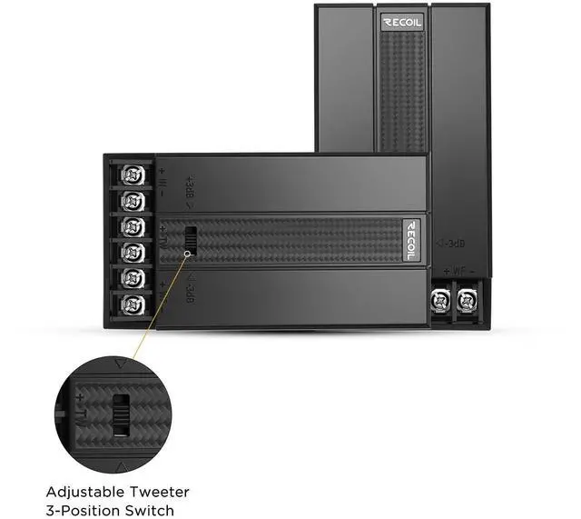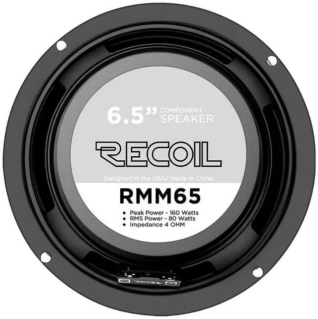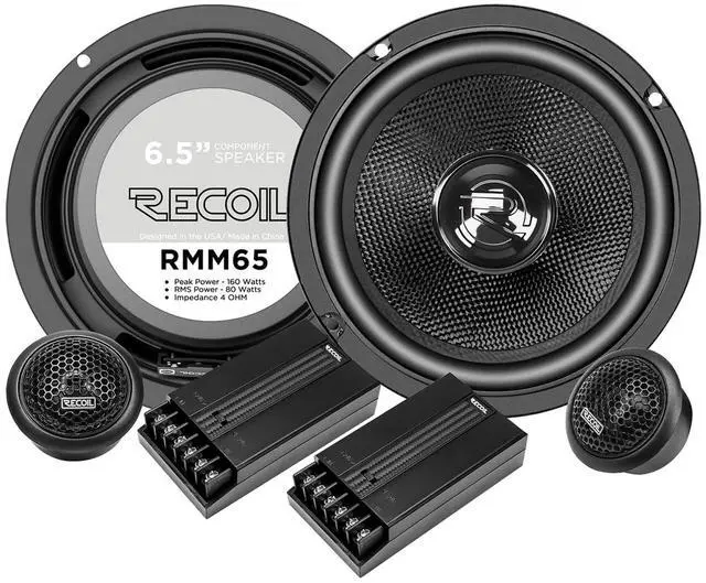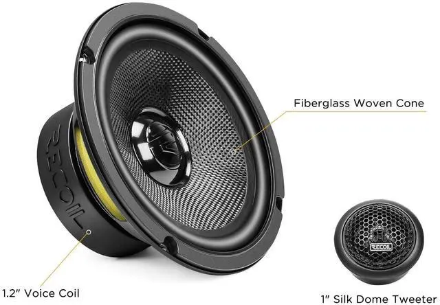 Recoil Echo Plus 6.5 Component Speaker System. Peak Power - 320 Watts (Pair) ^^ RMS Power - 160 Watts (Pair) ^^ The 1.2 high-temperature Kapton voice coil can handle extreme heat and maintain its structural integrity meaning long life out of your speakers. ^^ Fiberglass woven cones enable faster midrange response. Surround/Cone Coupling utilizes a high temp adhesive which assure the cone and surround do not separate in high power uses. Butyl rubber surrounds provide durability and deeper mid-bass impact. ^^ Silk soft-dome tweeters feature oversized 1 voice coils for greater heat dissipation and higher power handling resulting in smooth, fatigue free highs.
