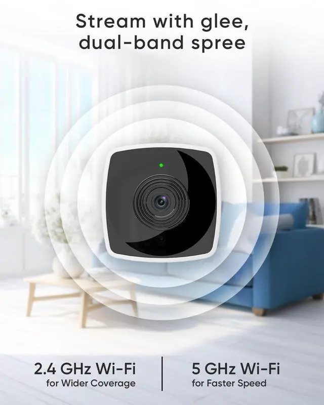 ^^ Reliable Dual-Band Connectivity: With support for both 5GHz and 2.4GH z Wi-Fi, the security cameras indoor ensures consistent, lag-free streaming. This dual-band flexibility allows you to choose the best connection for your home environment, providing reliable surveillance and security. ^^ Flexible Setup &