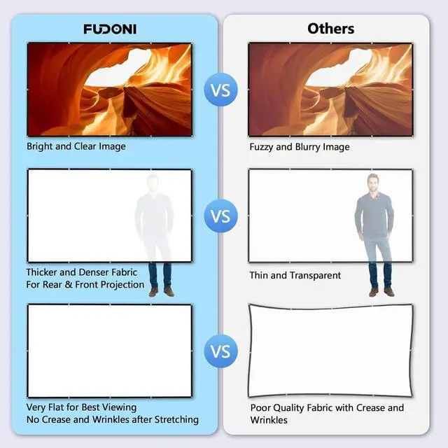 Material Projector Screen: This projector screen outdoors uses a soft touch, durable washable, and stretchy thick polyester fiber material. This outdoor projector screen will not wrinkle after squeezing, folding, and washing, providing you with the clearest projection quality. ^^ 178Wider