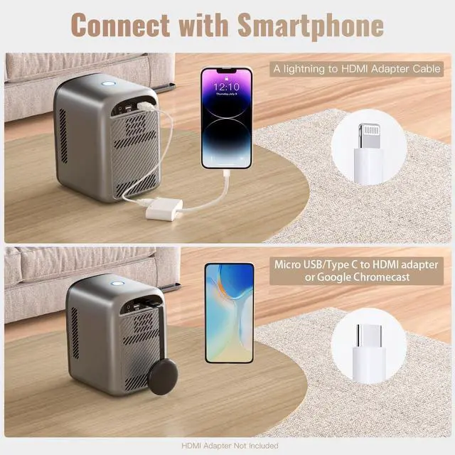 Multimedia CompatibilityThe ceiling projector is equipped with HDMI, USB, Audio port with an included HDMI cable. This phone projector is the perfect solution for a variety of media devices including but not limited to TV Stick/Box, USB flash drives, Game Consoles, PCs, Smartphones, Tablets, and Laptops. Our small projector is easy to use and provides a great value